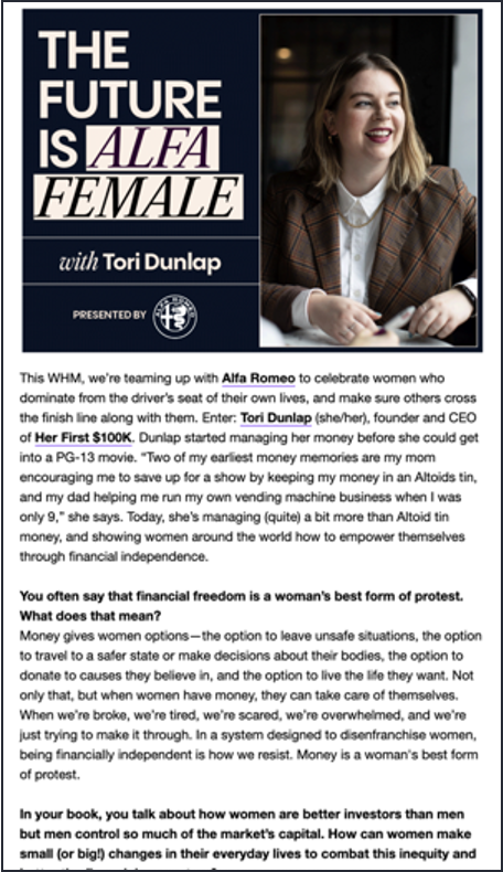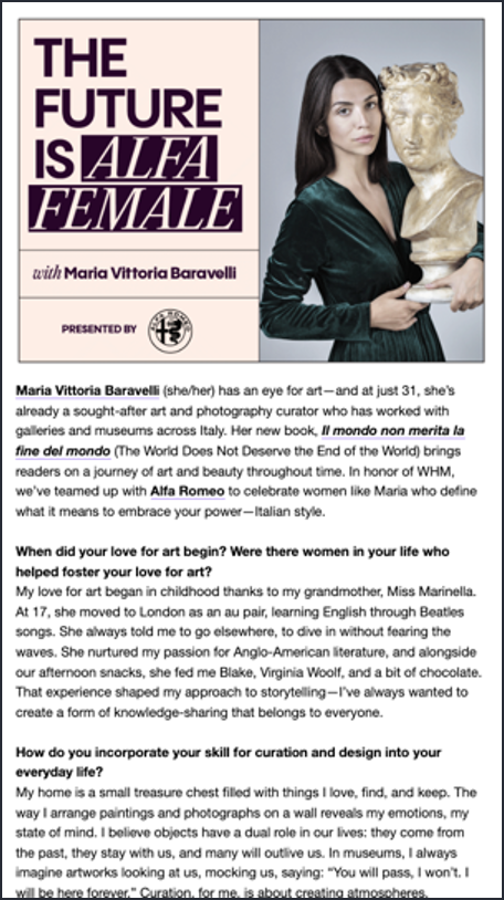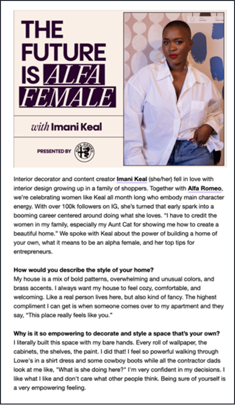 Through high-impact placements, premium editorial environments, and emotionally resonant storytelling, we encouraged subscribers to see Alfa Romeo not just as a luxury performance brand — but as a lifestyle ally championing their goals. The result was a campaign that felt less like an ad and more like a celebration of women defining their own success.